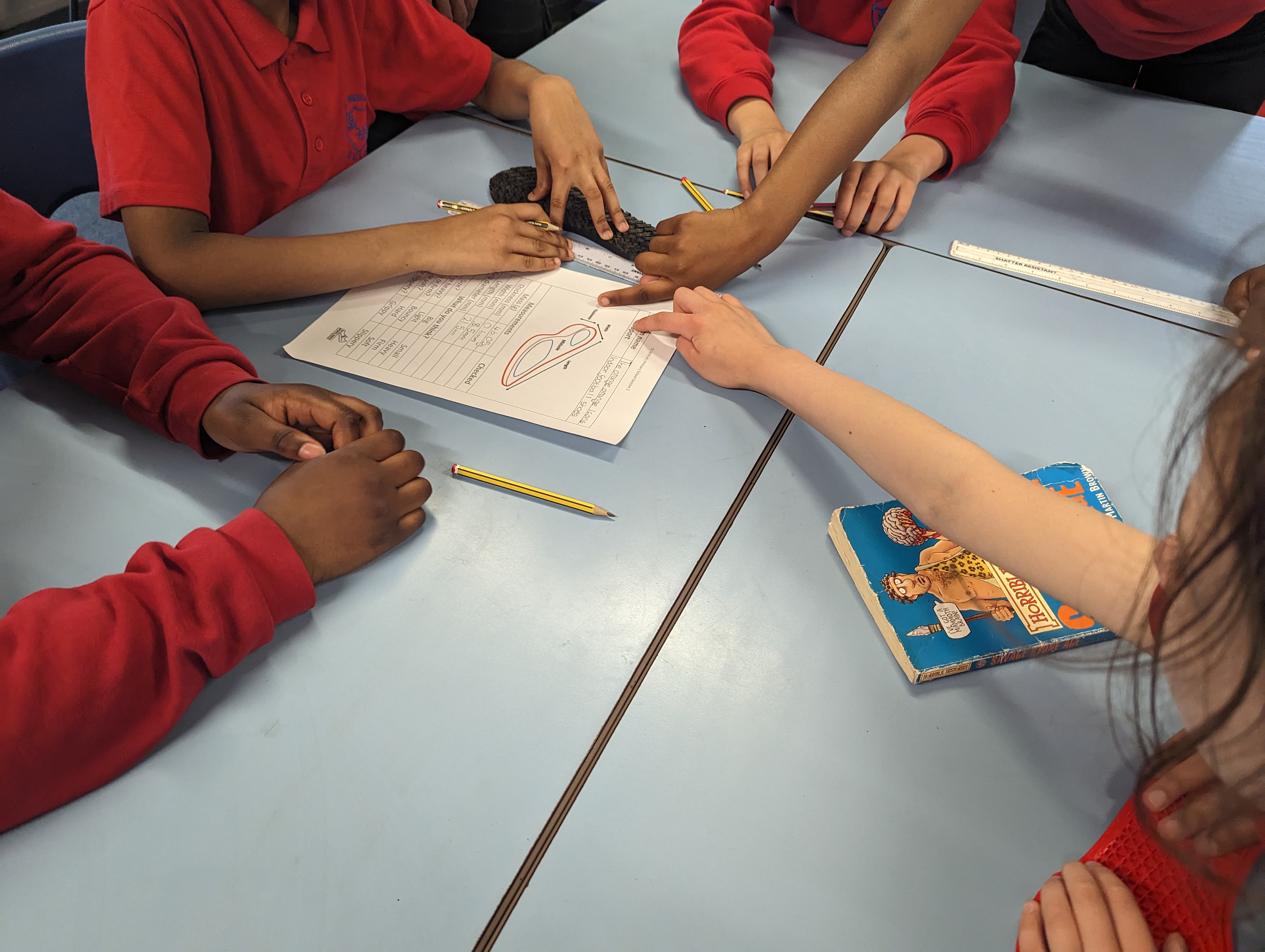 The children received A6 versions of the posters and a project sticker. They handled various dissected shoes while discussing how the design related to the intended purpose for each sport.